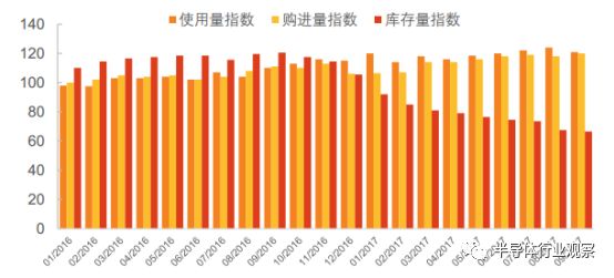 由于需求旺盛而供给不足,下游半导体企业库存逐步下降,硅片价格逐步上升。 根据SUMCO 预计,其客户的库存指数从 2017 年开始逐步下降,库存目前已达到近几年的最低水平。另外,根据 SUMCO 预计, 300mm 硅片在 2017 年 Q4 预计涨价 20%,进一步在2018 年涨价 20%,未来几年硅片供给仍然存在明显缺口。