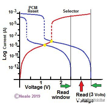 当读取PCM的两个不同数据状态时,两个绿色标记点将是正常操作的两个读取电流或电压电平,设置存储器单元的较低串联电阻将导致选择器已切换,致使电流升高,如上面的绿色标记所示。