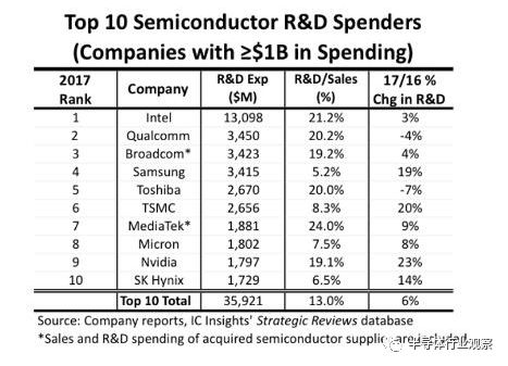 根据ICinsights的统计显示,2017年排名前10位的厂商总支出增加至359亿美元,当中有高通、博通、联发科和英伟达四家无晶圆厂,TSMC一家晶圆厂和英特尔、三星、东芝、美光和SK海力士五家IDM。其中,英特尔以超过130亿美元的美元的研发投入位居榜首,研发支出占销售额的百分比为21.2%,高于2010年的16.4%和1995年的9.3%。这主要因为英特尔作为摩尔定律的坚定追随者,一直在推进制程工艺的前进,往10nm之后,他们要继续走下去,就必须提高其研发投入。