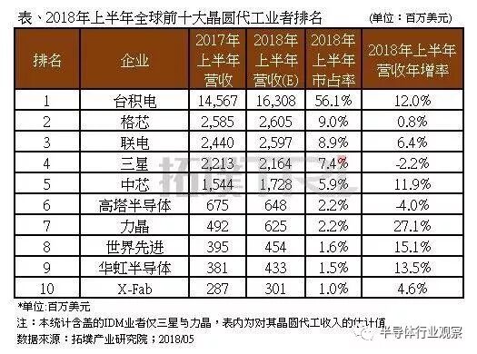 下图所示为拓墣产业研究院于2018年5月给出的2018上半年全球前十大晶圆代工厂的营收及同比增长情况。