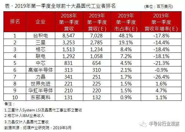 下图则为拓墣产业研究院今年3月公布的全球前十大晶圆代工厂在2019年第一季度营收和同比增长情况。