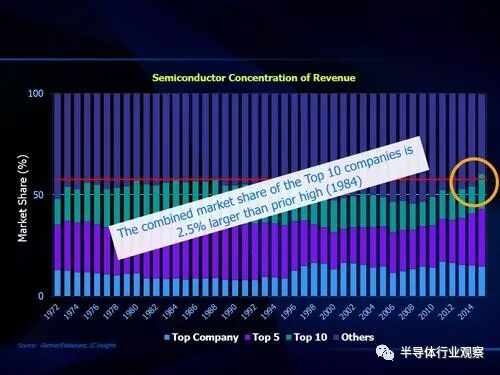2015年出现了多年未见的现象,即前10大半导体公司的合计市场占有率首次超过了过去几十年当中的最高值(1984年),虽然只高出了2.5个百分点,这在很大程度上是由几家公司突如其来的合并导致的,如下图所示。