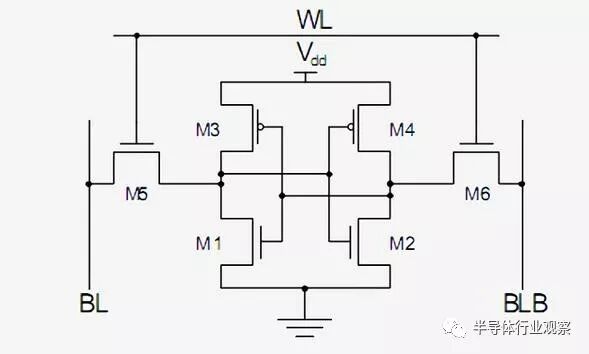 实现单个SRAM的标准方法是使用如下所示的6个晶体管。顶部信号(标记为WL,Word Line)是地址,当它被使能时,存储在这个1位单元中的数据被发送到的位线(标记为BL,Bit Line)。BLB输出被称为Bit Line Bar,即位线的翻转值。你应该认识晶体管的两种类型,并且M3、M1与M4、M2一起构成了一个反相器。