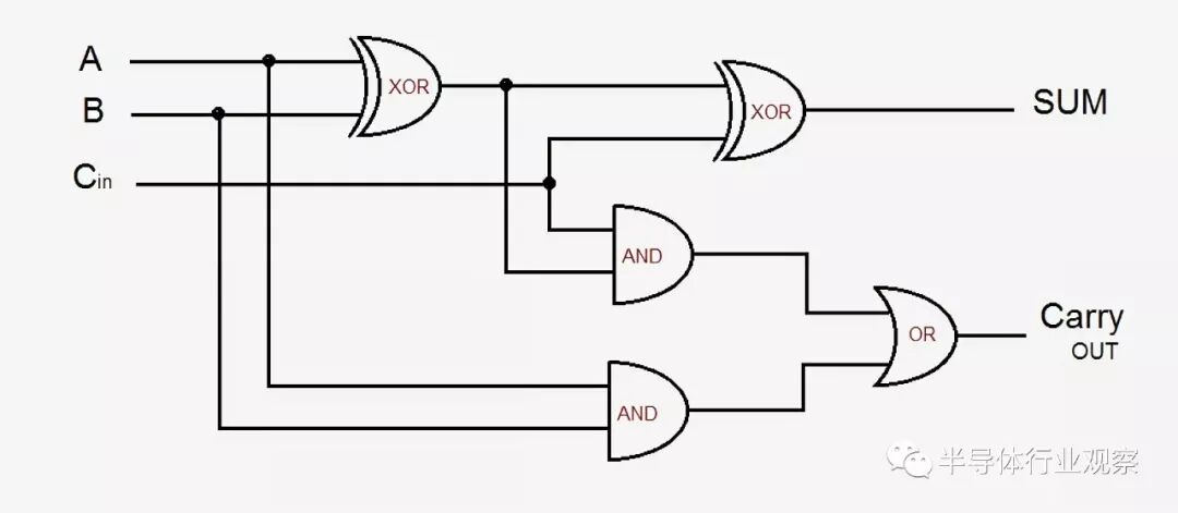 举一个简单的例子,我们将看到一个基本的加法器——1位全加器。它接受三个输入——A、B和输入进位(Carry-In),并产生两个输出——和(Sum)与输出进位(Carry-Out)。基本设计使用五个逻辑门,它们可以连接在一起,创建你想要的任意大小的加法器。现代设计通过优化一些逻辑和进位信号来改进这一点,但基本原理仍然相同。