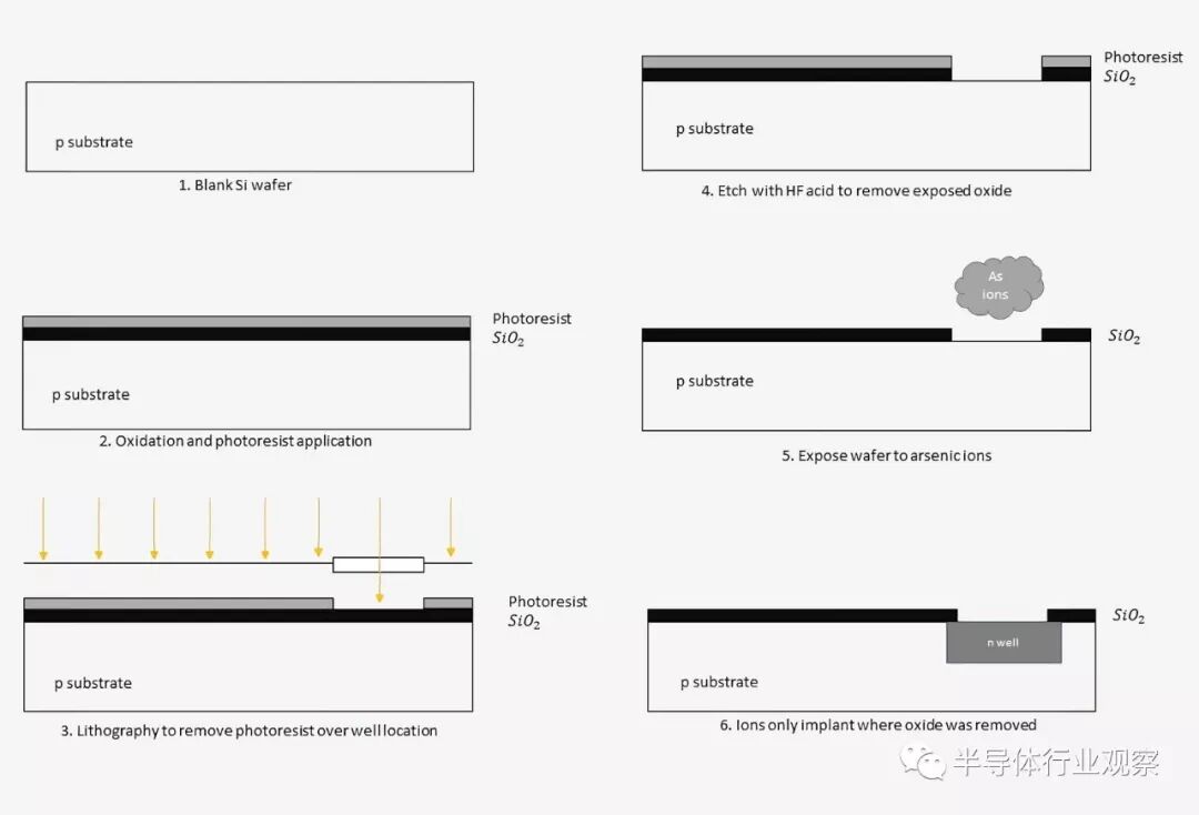 晶圆被氢氟酸蚀刻以溶解除去光刻胶的二氧化硅。然后除去光刻胶,只留下下面的氧化层。掺杂离子可以被应用到晶圆上,并且只能在氧化物中有间隙的地方植入。