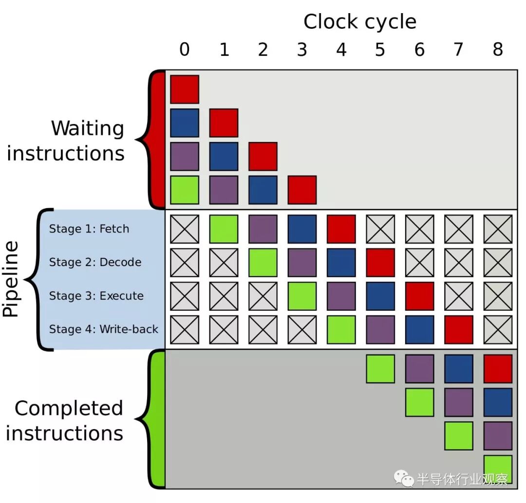 4级流水线示例。彩色方框表示相互独立的指令。(图片来源:维基百科)