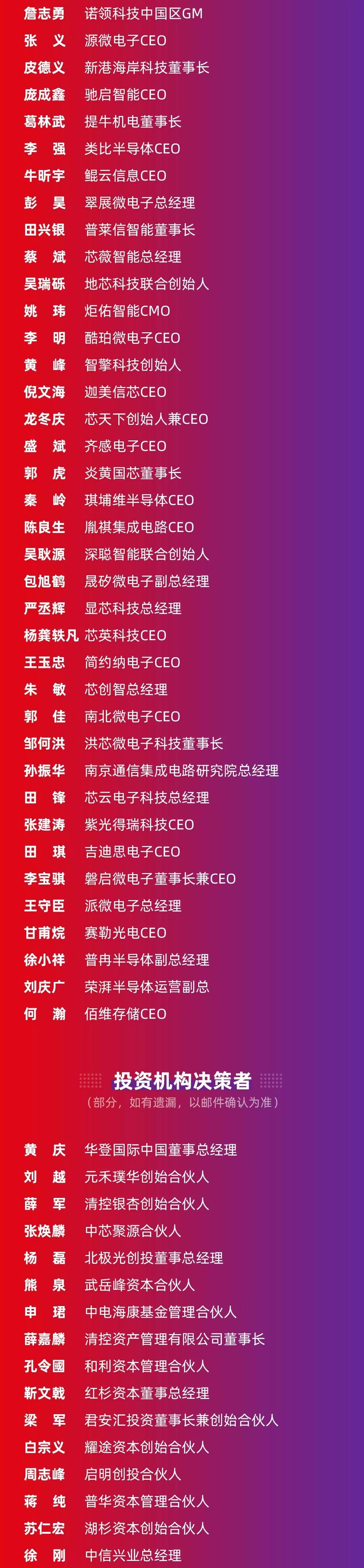 第二届中国芯创年会将邀请国内相关政府领导、国际知名企业高层、主板/科创板半导体上市公司创始人、150+知名半导体投资机构合伙人、250+半导体行业公司创始人/董事长/CEO(已完成至少一轮融资)等近400位行业领袖共赴本次盛会,交流中国芯创业/投资心得体会,共商集成电路产业发展大势!