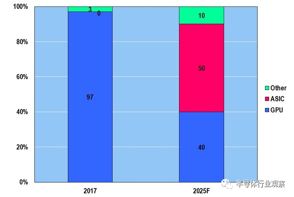 如上所述,由于大数据规模的扩大,带动处理大数据的AI半导体市场增长,到底什么样的AI半导体会成为主流呢---这是经常变化的(下图5)。在2017年,NVIDIA的GPU席卷全球,市场份额达到97%,据预测,到2025年GPU市占率会下滑至40%甚至更低,而ASIC的市占率会达到50%。图5:AI半导体种类的变化(预测)。(图片出自:McKinsey)换句话说,由于普通GPU(GPGPU:General-purpose computing on graphics processing units)的处理性能不足,因此出现了诸多专用AI半导体(如智能手机专用、无人驾驶汽车专用、边缘计算机专用),且占一半以上份额。但是,即使是ASIC AI,要处理逐年不断增长的大数据也是十分困难的。据预测,仅靠提高芯片本身的性能已经无法同时满足AI半导体的高速处理、节能、成本优势等目标。