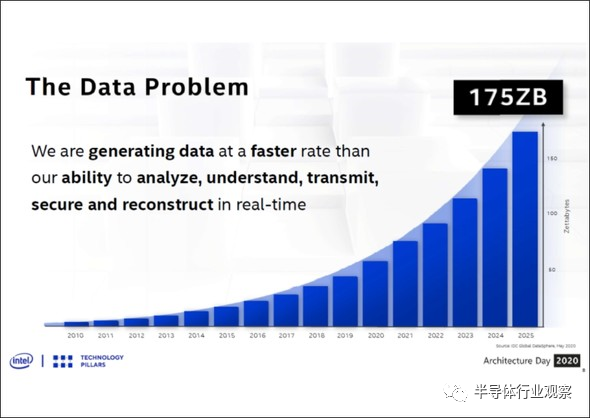 2020年SoC中的CPU核数为13,GPU为27个,到2031年,CPU增至95个(7.3倍)、GPU增至97个(3.6倍)。其中,CPU的吐出量在2020年为0.32 TFLOPS/sec、2031年将会增为2.64 TFLOPS/sec,增长了8.25倍。但是,这是不考虑因发热问题而产生的速度下降问题,如果因发热而导致速度下降,2031年的吐出量仅为0.95 TFLOPS/sec,增长约3倍。所谓的“TFLOPS/sec”指的是“tera floating-point operations per second”的缩略,是表示计算机处理能力的单位,tera为1万亿,FLOPS为每秒浮点计算次数。因此,1 TFLOPS为浮点每秒计算一万亿次。那么,从2020年到2031年,SoC中的CPU核数将增长7.3倍,增至95个,如果不考虑因发热引起的速度低下问题,CPU的预测速度将提高8.25倍,提高至2.64 TFLOPS/sec。因此,预计在2031年登场的SoC AI半导体与2020年相比,其计算能力将会提高60倍=7.3*8.25。但是,AI半导体处理的数据量如上图6英特尔所展示的一样,在两年内增长64-100倍,即使是最小值64倍,在2031年将会达到10亿倍(2020年的64的五次方),仅靠增加核数、提高各核的吐出量,处理能力还是不足。