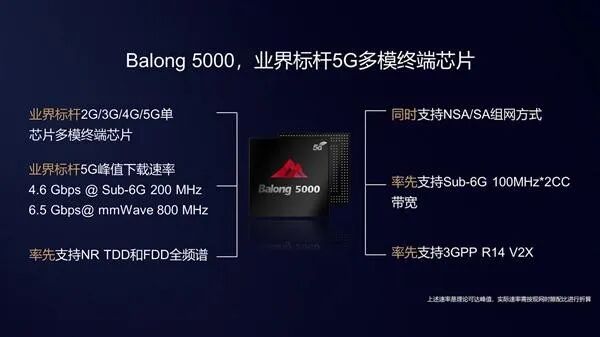 在MWC 2019预沟通会上,华为发布了号称世界第一款单芯多模5G基带芯片巴龙5000,首次将5G芯片巴龙5000 集成到了华为首款旗舰5G SoC芯片麒麟990上。华为当时称,巴龙5000“是全球最强的5G基带”。