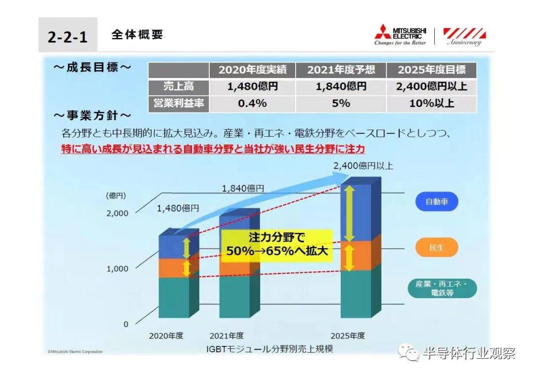 三菱电机株式会社成立于1921年1月15日,于1997年率先量产混合动力汽车的功率半导体模块。三菱电机是日本IGBT领域的王者。2021年11月,三菱电机将公司功率器件业务的目标设定为——到2025年销售额2400亿日元以上、营业利润率10%以上。为实现目标,三菱电机宣布将在未来五年内向功率半导体业务投资1300亿日元。该公司计划在福山工厂(广岛县福山市)新建一条 12 英寸(300 毫米)晶圆生产线,并计划到 2025 年将其产能比 2020 年翻一番。