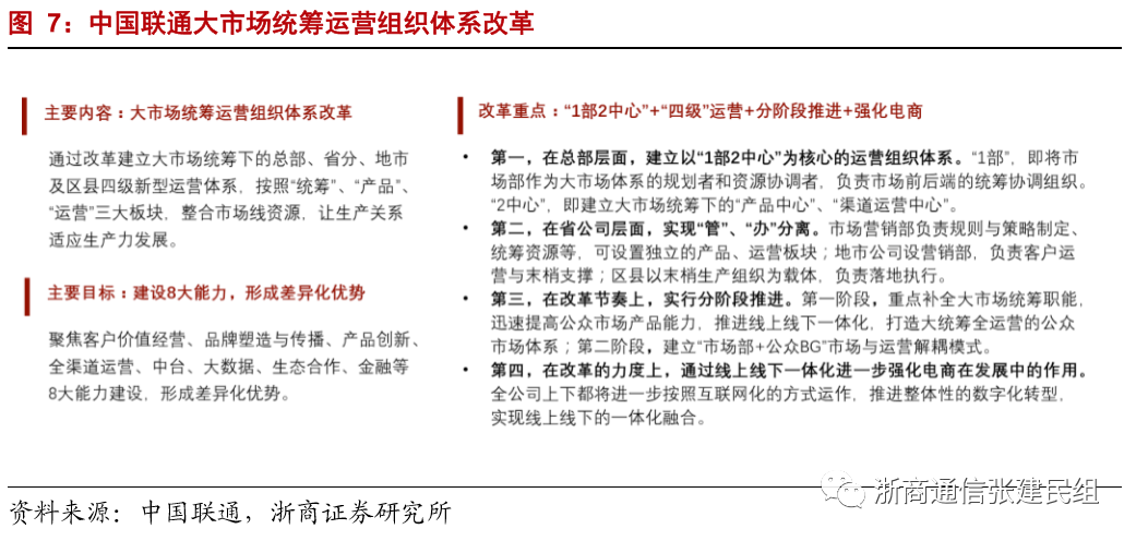 大市场统筹运营组织体系改革主要核心是三个,第一是产品,过去产品围绕主要价格等因素,未来将全方位审视从更广更高的层面考虑产品;第二是渠道,因为中国联通电商渠道在三家最强,占比最高,但是同时带来了线上线下渠道的矛盾,需要考虑如何把渠道的分力变成合力;第三是客户经营,希望通过大数据精准分析下的客户运营让在网用户更加满意;整体通过改革彻底改进前端效率,客户市场细分更加满足各类客户的核心需求。