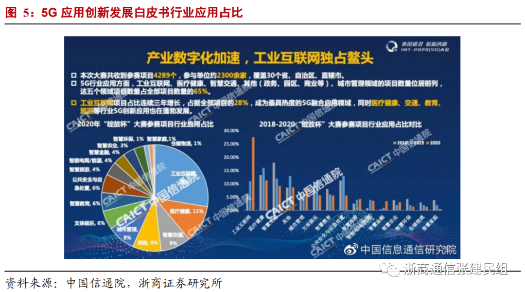 垂直行业应用方面,在IMT-2020(5G)大会5G创新发展高峰论坛上,中国信通院、5G应用产业方阵(5GAIA)和IMT-2020(5G)推进组共同发布了《5G应用创新发展白皮书——2020年第三届“绽放杯”5G应用征集大赛洞察》,白皮书显示: