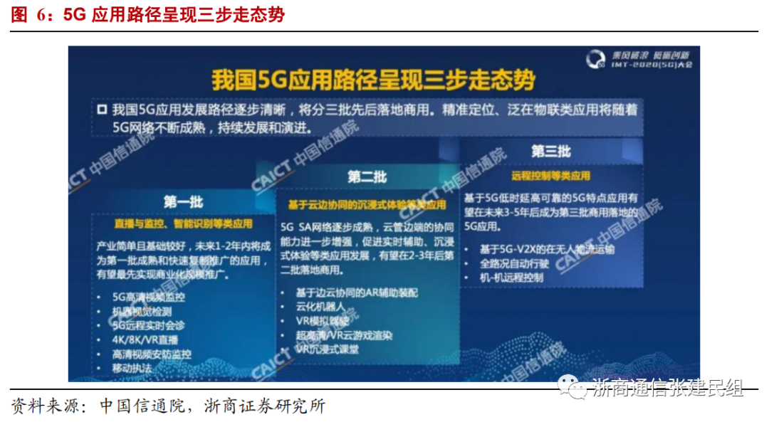 4)白皮书认为我国5G应用路径呈现三步走态势。精准定位、泛在物联类应用将随着5G网络不断成熟,持续发展和演进。第一批实现直播与监控、智能识别等类应用。第二批实现基于云边协同的沉浸式体验等类应用。第三批实现远程控制类等应用。