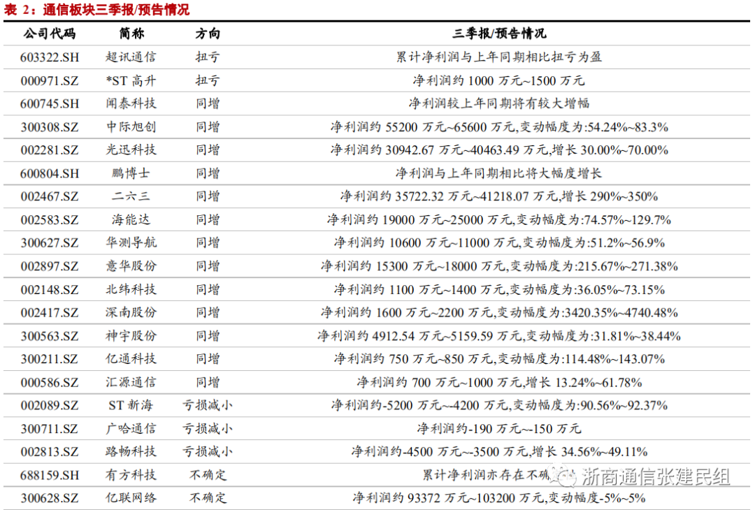 通信(中信)117只个股中,44只发了三季报/预告/快报,其中2、13、3、10、3、7只分别实现归母净利润的扭亏、同比增长、亏损减小、同比下降、亏损扩大、转亏。其中二六三、海能达、意华股份、中际旭创、光迅科技、华测导航、深南电路、北纬科技、亿通科技等均实现了业绩的大幅增长。
