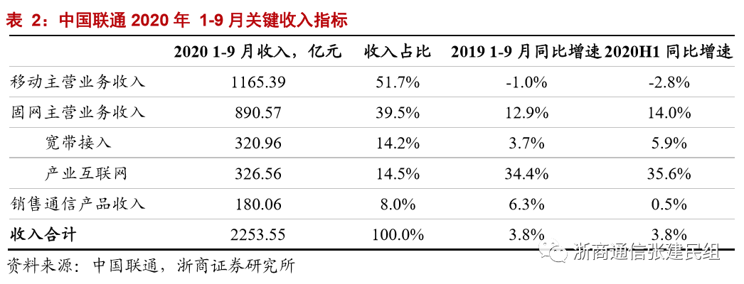 1-9月中国联通主营业务收入增速较行业平均3.2%领先1.2pct。