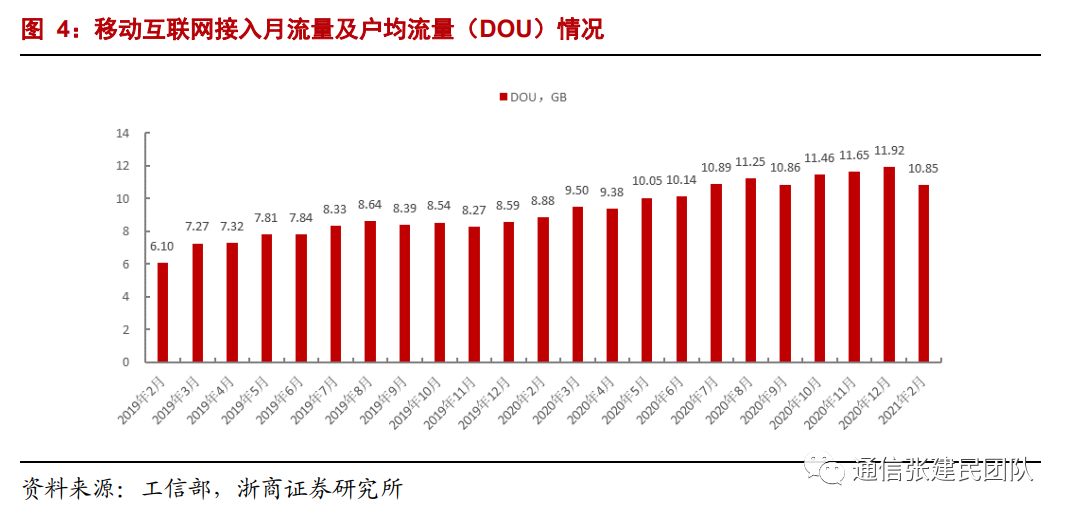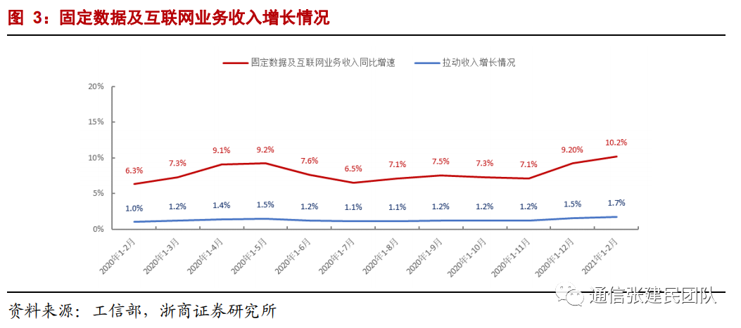 电信业务收入累计同比由2019年1-8月的0.0%持续增长至2021年1-2月的5.8%,我们之前就电信业务收入拐点形成的判断基本得到验证。