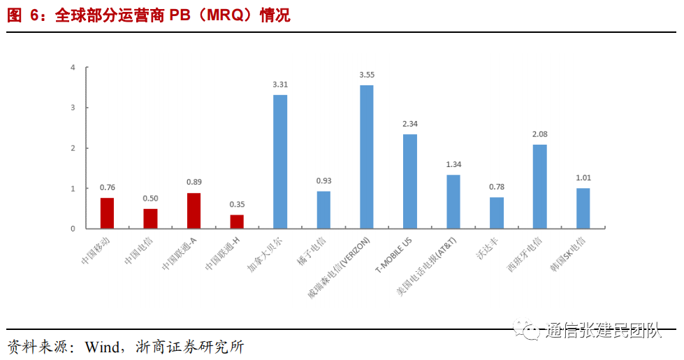 当前H股中国移动、中国电信、中国联通PB仅0.76、0.50、0.35倍,明显低于5年历史中枢的1.29、0.80、0.77倍,更低于全球可比水平1.92倍。