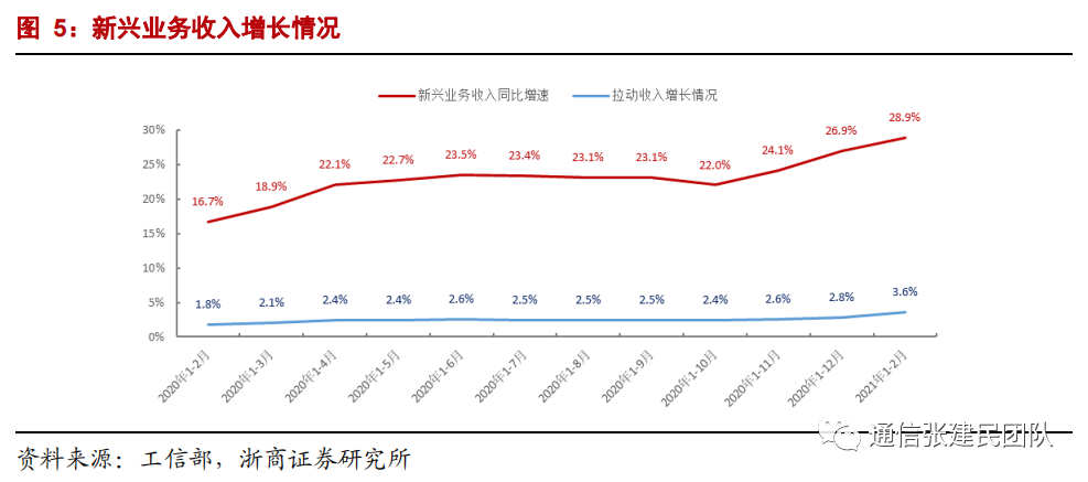 2020年1-2月行业增速超市场预期,电信业务收入累计同比增长5.8%,较2020年全年同比增速3.6%提升2.2pct,收入增速提升明显。