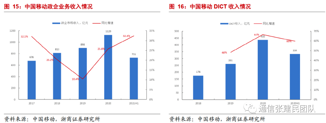 政企动能强劲:收入同比增32.4%,其中DICT收入334亿同比增59.8%,持续高增。移动云97亿同比增118%,5G垂直行业带动DICT增收超60亿。行业信息化大趋势下,公司政企市场收入有望持续快速增长。