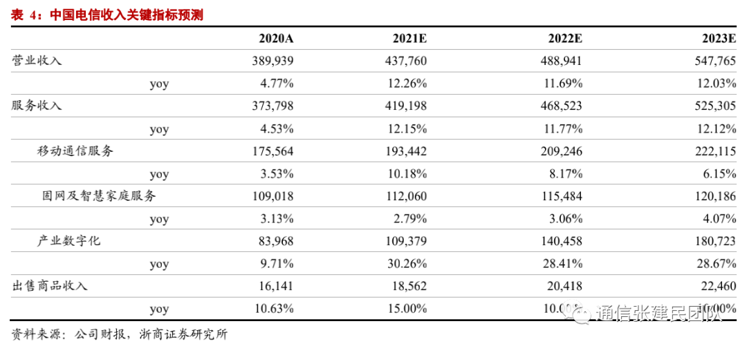 预计公司2021-23年实现营收4378亿、4889亿、5478亿,同比增12.29%、11.69%、12.03%;实现通信服务收入4192亿、4685亿、5253亿,同比增12.15%、11.77%、12.12%;实现归母净利润260亿、275亿、312亿,同比增长24.87%、5.44%、13.70%。1)移动通信服务:在5G用户渗透率提升和价值经营提振下有望持续稳定增长,综合对移动用户数净增、5G渗透率、DOU、流量价格等关键因素的假设预判,我们预计2021-2023年移动服务市场收入同比增速10.2%、8.2%、6.2%。2)固网及智慧家庭服务:智家业务价值逐步得到体现,带来家庭市场收入稳定增长,综合对固网用户数净增、固网用户ARPU未来趋势等关键因素的假设预判,我们预计公司固网及智慧家庭服务收入2021-2023年同比增速2.8%、3.1%、4.1%。3)产业数字化:社会信息化数字化转型趋势叠加5G行业应用的逐步渗透,产业数字化业务成为中国电信增收主要驱动力,综合对包括IDC、云计算、物联网等关键细分业务行业空间整体、业务增速等关键的假设预判,我们预计公司产业数字化收入2021-2023年同比增速30.3%、28.4%、28.7%。
