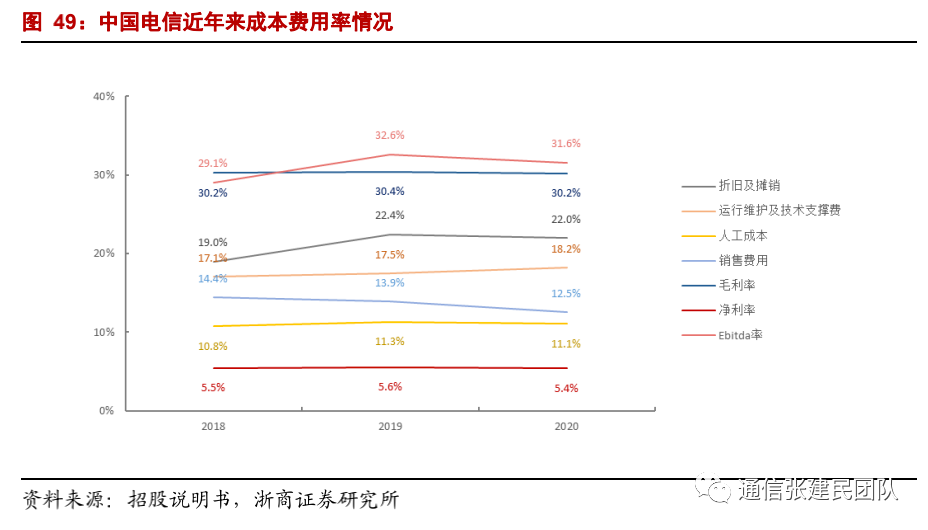 相较于中国移动、中国联通,公司呈现出发展更为均衡、创新能力领先的竞争优势,帮助公司在经营数据的表现上更为突出。收入结构来看, 2020年中国电信个人、家庭、政企业务分别占通信服务收入比47%、29%、22%,较中国移动和中国联通的收入结构更为均衡。![]()