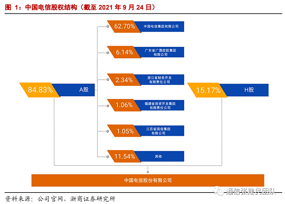 中国电信是全球大型的领先的全业务综合智能信息服务运营商,最终控股股东是中国电信集团有限公司,截至2021年9月24日,中国电信集团有限公司间接持有中国电信约62.70%的已发行总股份,国务院国资委是公司实际控制人。
