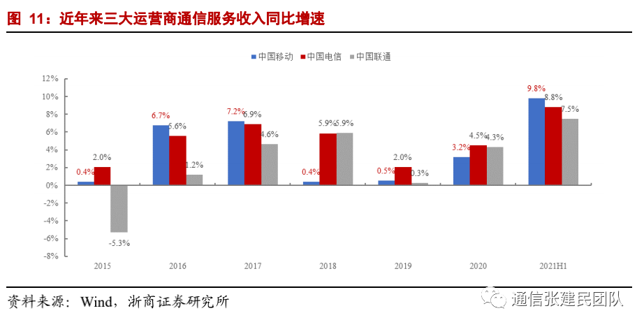 移动用户持续增长,带动公司近年来移动业务增速领跑行业,2020年公司移动服务收入1816亿元,同比增长3.5%,占通信服务收入比例达到48.6%。叠加5G用户渗透率提升带动ARPU企稳恢复,2021年上半年公司移动服务收入979亿元,同比增长8.2%,增速超预期。随着未来5G用户渗透率的持续提升和5G应用的发展,公司移动业务增速有望继续保持乐观的发展预期。![]()