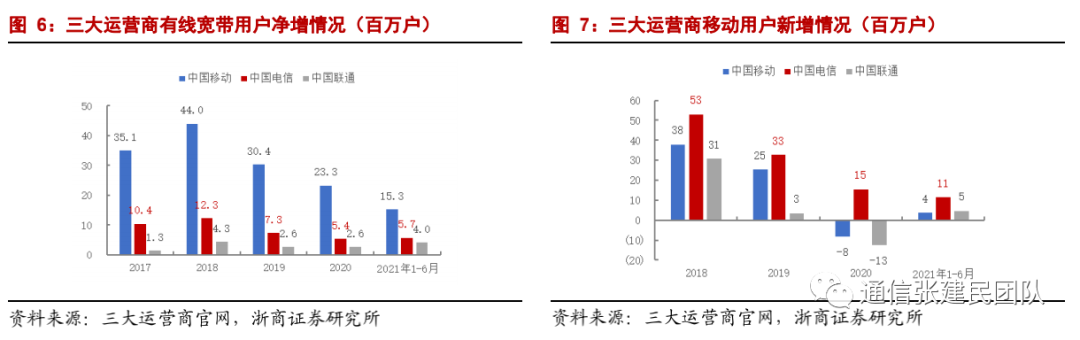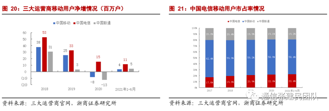 4G时代,公司紧抓流量红利释放的宝贵窗口,加快产品创新,全面融合升级,增强网络优势,市场拓展成效显著,移动用户快速增长。2019年以来,面对移动市场渗透率饱和以及同质化竞争压力,公司坚持有价值地规模拓展移动用户市场,叠加5G套餐升级机会、携号转网机会,公司用户数实现持续净增长,领跑行业。截至2021年6月,公司移动用户数达到3.62亿户,较2020年底提升1147万户,移动用户市占率从2017年的17.6%提升到22.4%。![]()