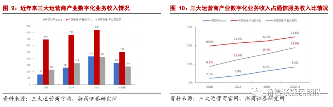 创新能力方面,尤其在产业数字化业务领域,面对5G和云网融合带来的数字经济巨大机会,公司加快构建以客户为中心的新型组织体系,打造纵向一体化的政企事业群,政企BG改革突破内部组织边界,强化跨领域能力协同,增强云化、平台化解决方案的研发创新,引入市场化的考核激励机制,旨在建立数字化供给和交付体系、打造专业化服务和运营能力、完善市场化运作和合作机制。2020年公司产业数字化相关业务收入规模达到840亿元,收入占比达到22.5%,行业领先。2021年上半年公司产业数字化收入占通信服务收入比例进一步提升至24.6%。![]()