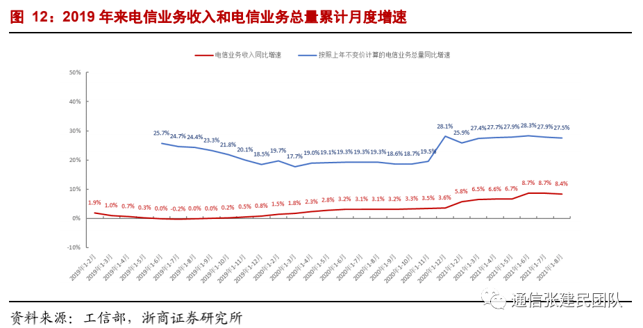 前期行业陷入剪刀差困境。2013年国内移动电话普及率超过90%逐步趋于饱和,运营商业务同质化,行业竞争加剧,电信业务总量与电信业务收入的剪刀差日益增大,运营商陷入增量不增收困境,行业整体盈利能力严重下滑。行业变局谋求高质量发展。2019年中国移动提出禁止终端补贴、禁止排他性行为、禁止考核市场份额、禁止任何赠送和变相赠送行为以及地域成本价的产品销售等;中国联通全面停止终端补贴政策, 清理5元互联网套餐,副卡控制在两张以内。2020年3月中国电信董事长柯瑞文表示坚决不打价格战,共同维护行业生态,共同繁荣5G产业。电信行业收入拐点已经形成。2020年全年,电信业务收入累计完成13564亿元,同比增长3.6%,我们之前就电信业务收入拐点形成的判断基本得到验证。2020年全年同比增速较2019年同比增速0.7%提升2.9pct;2021年1-8月,电信业务收入累计完成9919亿元,同比增长8.4%,增速进一步较2020年增速提升4.8pct;自2019年1-8月起电信业务收入累计同比转正以来呈现快速增长态势。![]()