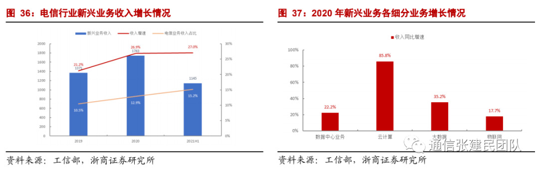 “平台+应用”的引擎作用已经凸显。运营商积极转型升级,推进 IPTV、互联网数据中心、大数据、云计算、人工智能等新兴业务,新兴业务成为运营商增值主要驱动,2021年1-8月完成相关业务收入1491亿元,同比增长28.1%,在电信业务收入中占比为15%,拉动电信业务收入增长3.6pct,占比较2020年底提升2.1pct。分细项来看,云业务增长势头最为强劲。2020年数据中心业务、云计算、大数据、物联网业务收入比上年分别增长22.2%、85.8%、35.2%、17.7%、13.6%。2021年上半年云计算、大数据收入同比增速分别达96.7%、31.3%。