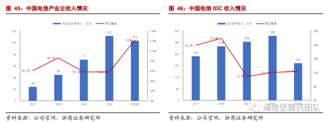 2020年公司总体云业务收入达到138亿元,同比增长58.4%,其中产业云业务收入达到112亿元,同比增长58.1%,产业云业务2018-2020年三年复合增速达到67%。根据IDC咨询的统计,公司在全球运营商公有云IaaS行业中收入规模排名第一,中国公有云IaaS+PaaS收入规模排名第四。基于公司强大的客户基础和数据中心资源布局、云网融合能力、安全可信、属地服务优势,公司云业务有望继续快速发展。2021年上半年公司产业云业务收入103亿元,同比大幅增长122%,IDC业务收入161亿元,同比增长10.5%。![]()