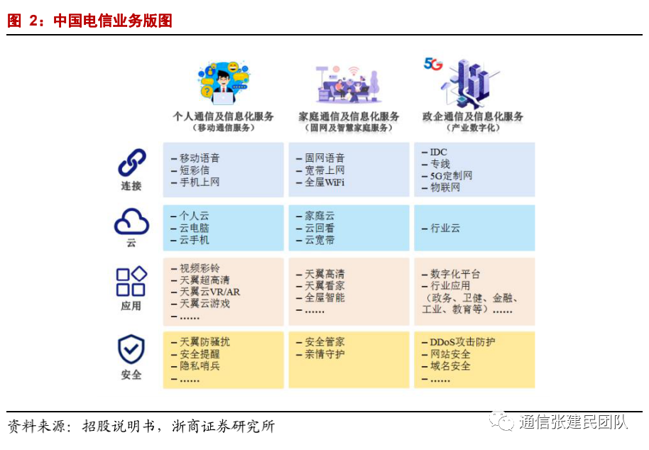 中国电信主要在提供固定及移动通信服务、互联网接入服务、信息服务以及其他增值电信服务等。面对数字经济新蓝海带来的新机遇、新业态、新模式,公司加快推动云网融合,丰富应用版图,已经实现从基础通信服务运营商向全业务综合智能信息服务运营商的转型,面向个人、家庭、政企市场提供连接、云、应用、安全的全业务通信及信息化服务。![]()
