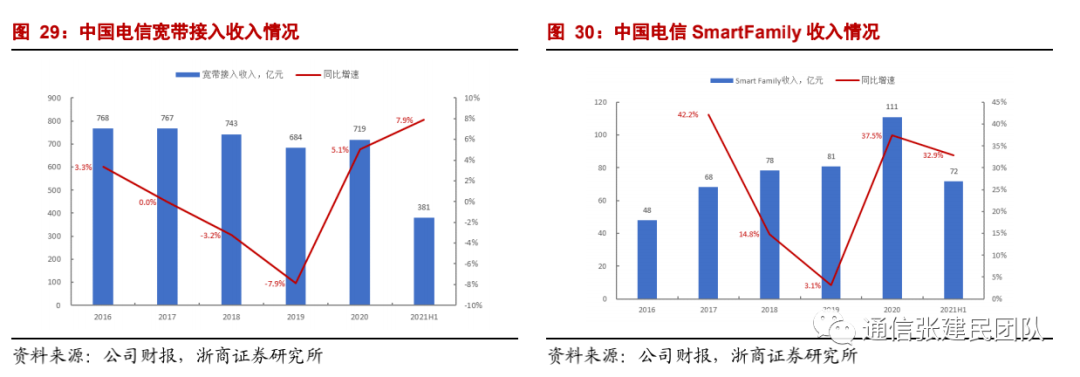 家庭业务是公司的传统优势业务,近年来面对中国移动发力家庭市场的竞争压力,公司积极布局家庭信息化,构建智慧家庭DICT产品服务体系,基于5G契机,进一步推广5G+光宽+WiFi6三千兆接入和全屋WiFi服务,宽带接入业务价值得到重塑,智家业务价值逐步得到体现。2020年,公司宽带接入收入719亿元,同比增长5.06%,扭转2017年以来的下跌态势,Smart Family收入达到111亿元,同比大增增长37.45%。2021年年上半年,公司宽带接入收入381亿元,同比增长7.9%,Smart Family收入72亿元,同比大幅增长32.9%,智家应用对宽带综合ARPU的带动从2020年上半年的13.3%提升到15.8%。![]()