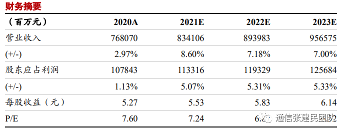 不考虑回A对股份摊薄影响,预计2021-23年收入增速8.6%/7.2%/7.0%,利润增速5.1%/5.3%/5.3%;股息率6.7%,当前PB 0.71倍,明显低于历史均值/行业均值的1.16/2.06倍,维持“买入”评级。
