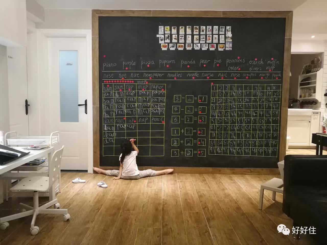 ▲ 一整面的黑板墙用来让孩子随意涂鸦和练习功课。