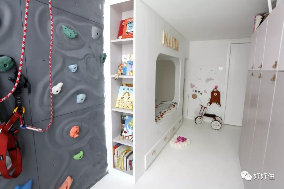住友@笑笑丹子 为了让孩子可以在家里就能得到锻炼,在儿童房的一面墙上安装了整面的攀岩墙,安全设备一应俱全,既让孩子玩的进行也能保证孩子的安全。