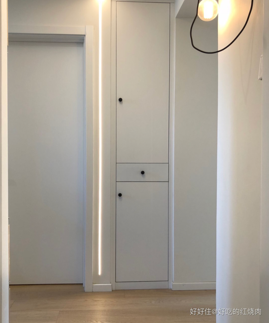 精装房原本的灯只是为了照亮而存在,毫无灯光效果可言,而后期对于灯具的改造,大多人还停留在挑选造型的阶段,视觉层面固然重要,但好不好用更重要。在床或者柜子下面安装一组灯带,家具就好像漂浮了起来,削弱了原本的体积感,更有趣。也可以做这样细线条的线性灯光,勾勒出空间的轮廓,是夜晚营造氛围的好手