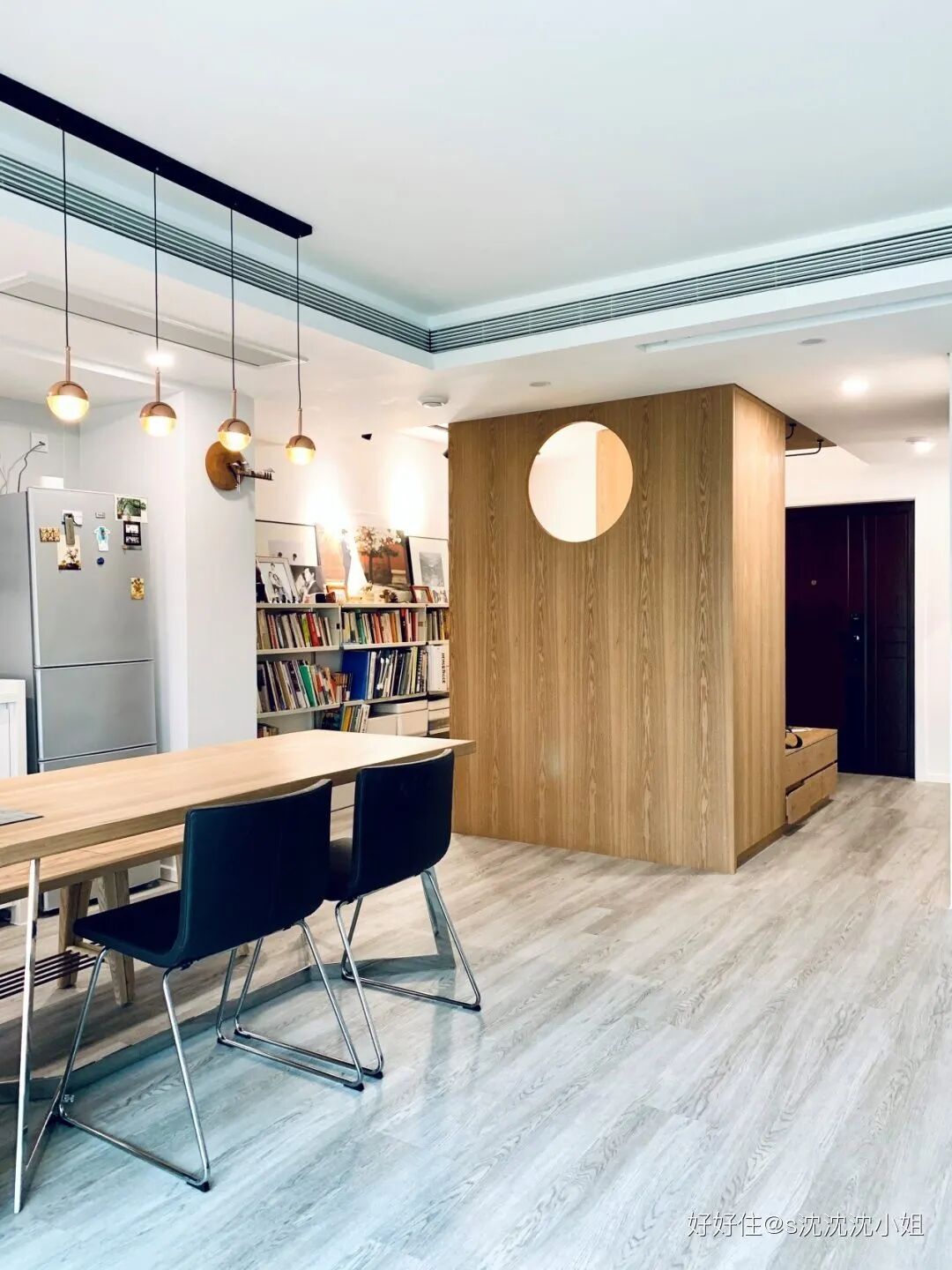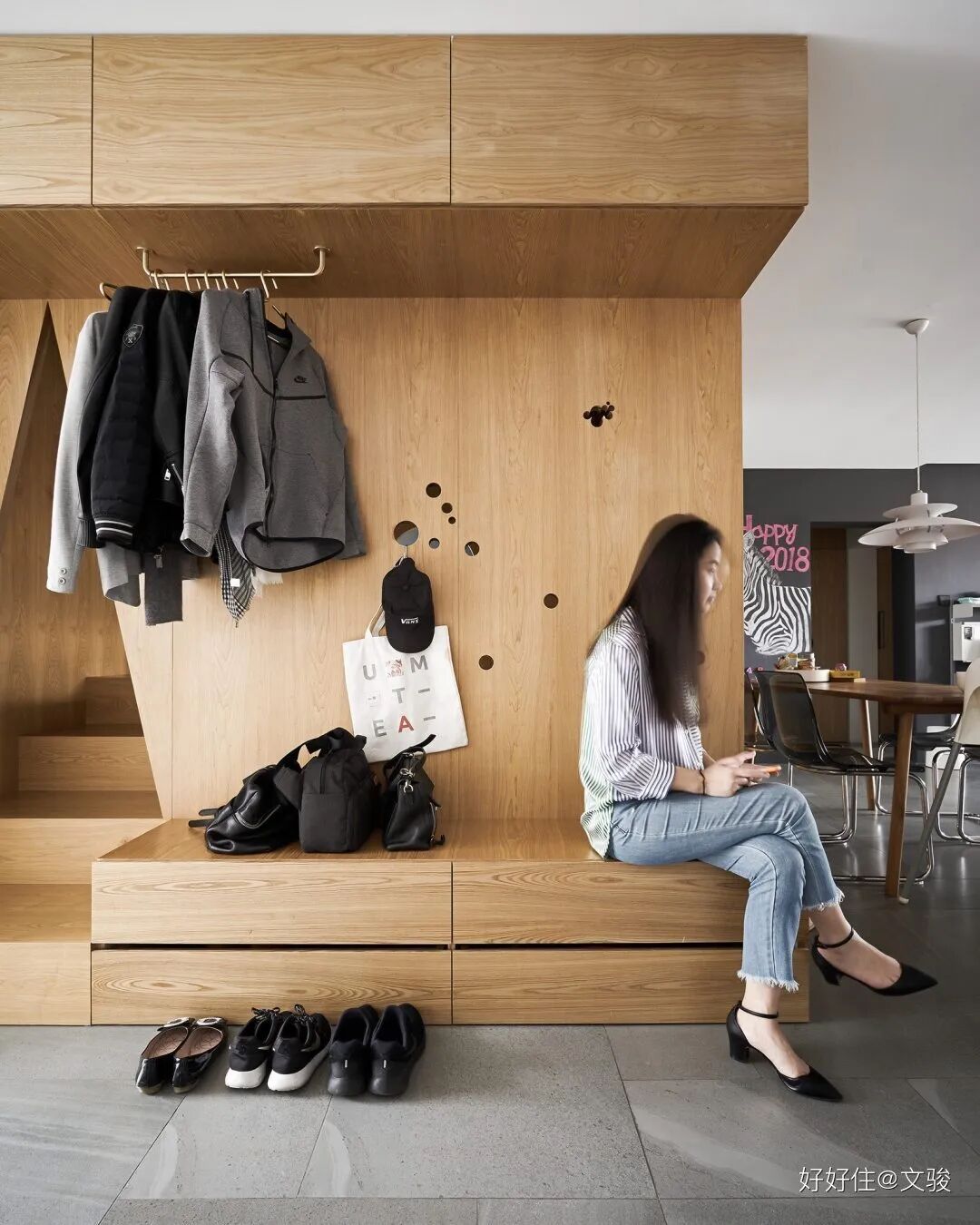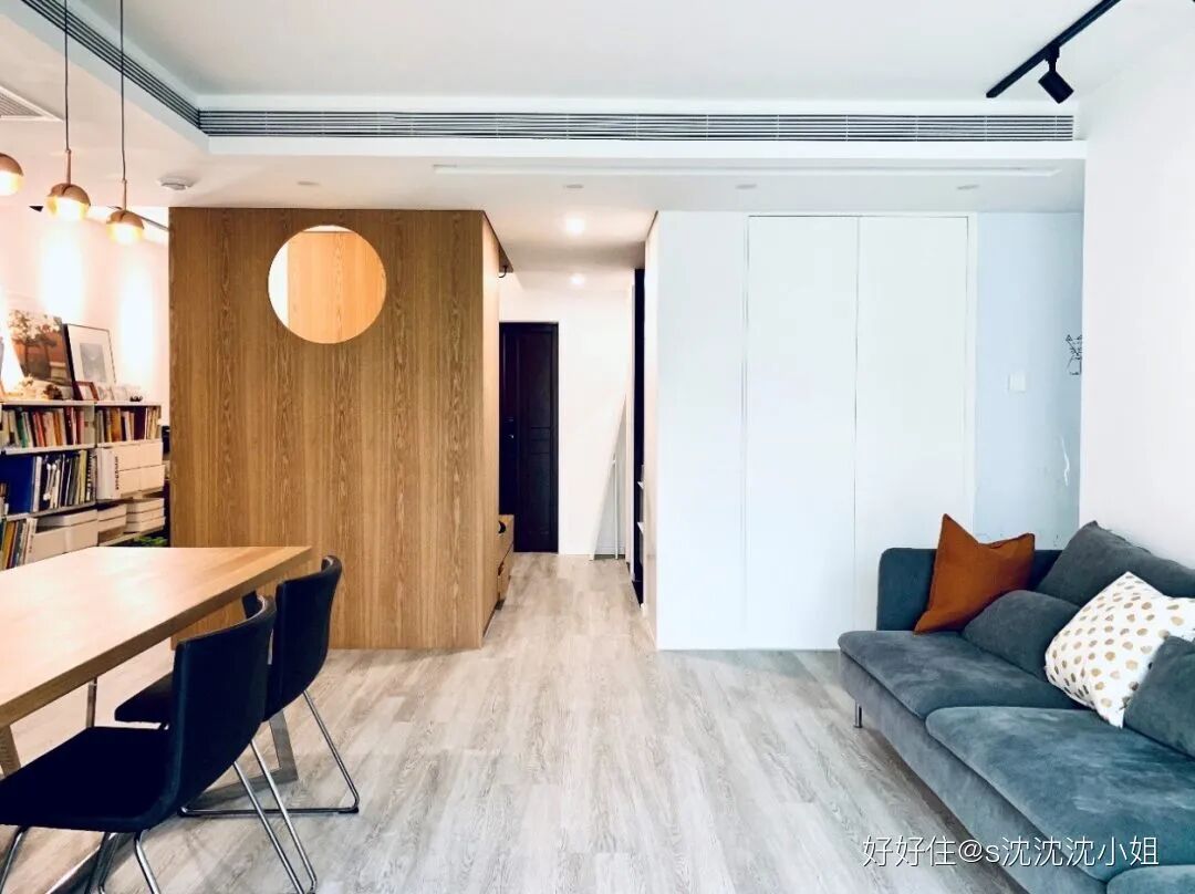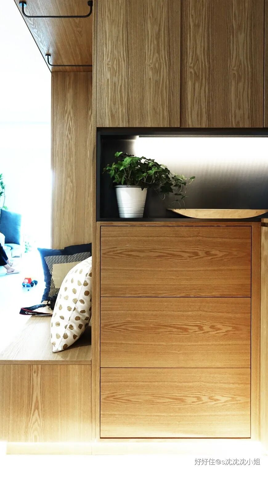 先说说玄关吧,看过不少没有玄关的家,说实话,@文骏 家的玄关着实是让人羡慕了。局促感?不存在的。上下柜体收纳鞋子空间充足,墙面挂衣服放包更是不在话下。