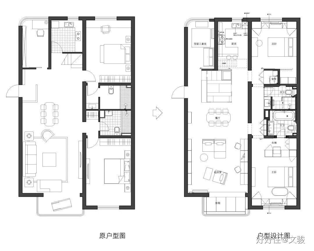 为了给儿子一个充足的成长空间,好好住设计师@文骏 在孩子出生后就从原来40㎡ 的旧家搬入了现在 135㎡ 的新家。面积虽然大,但户型却有着很大的问题:只有一南一北两间卧室,却有着 4.8 米 x 9 米的客厅空间。