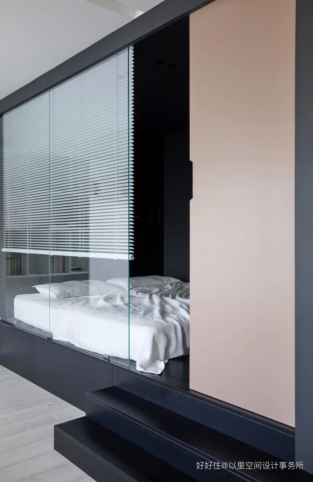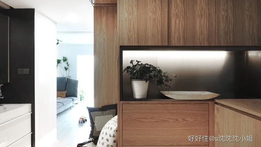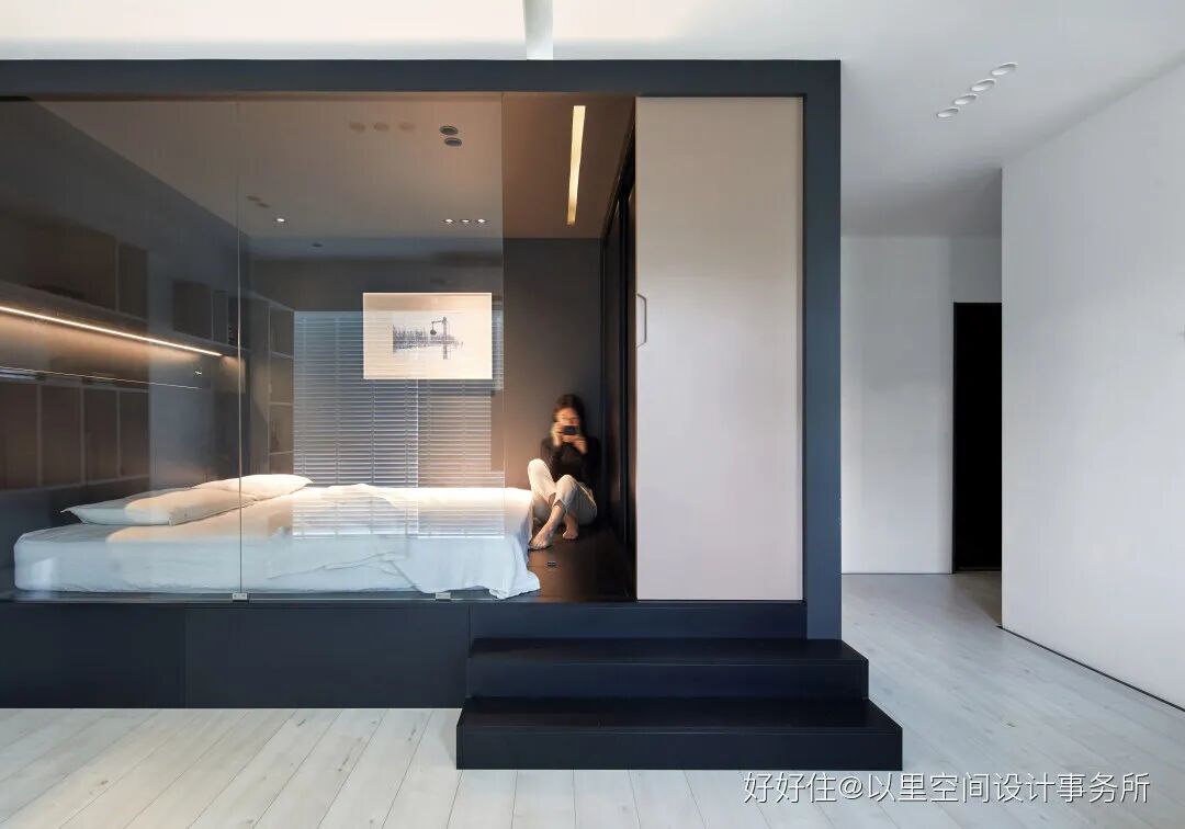 于是设计师就此发挥,把「小」这件事发挥得更加极致,硬是在 43 平米的空间中压缩出一个 6 平米的盒子,实现 mini 房中房。