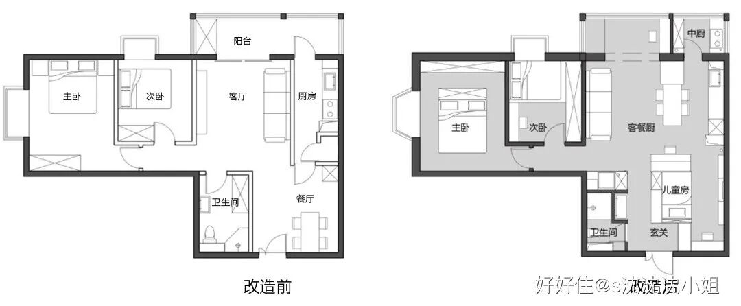改造的关键在于新增的儿童房放置在何处,经过多次比较后,入户门右手边是个合适的位置。