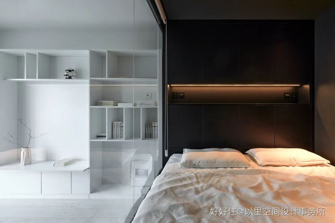 与此同时,卧室的抬高也拉开了与客厅之间的层次关系,加上一黑一白的空间对比,收获了个不一样的下沉式客厅空间。