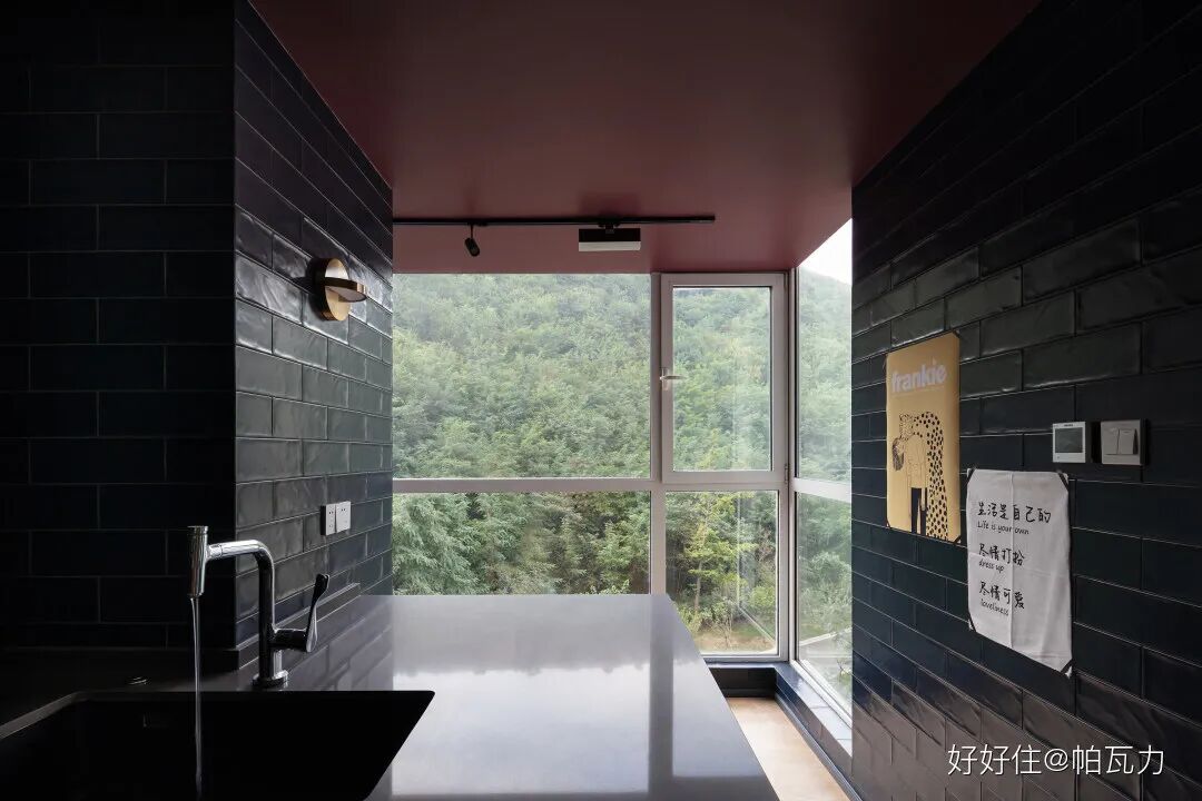厨房与餐厅联通,用了古朴的双开门。拆掉外侧阳台,厨房面积变大,功能分区也更明确。以中岛为划分,另一边作洗衣区使用。深蓝色瓷砖+复古紫吊顶撞色,绝佳采光之下完全不显沉闷。![]()