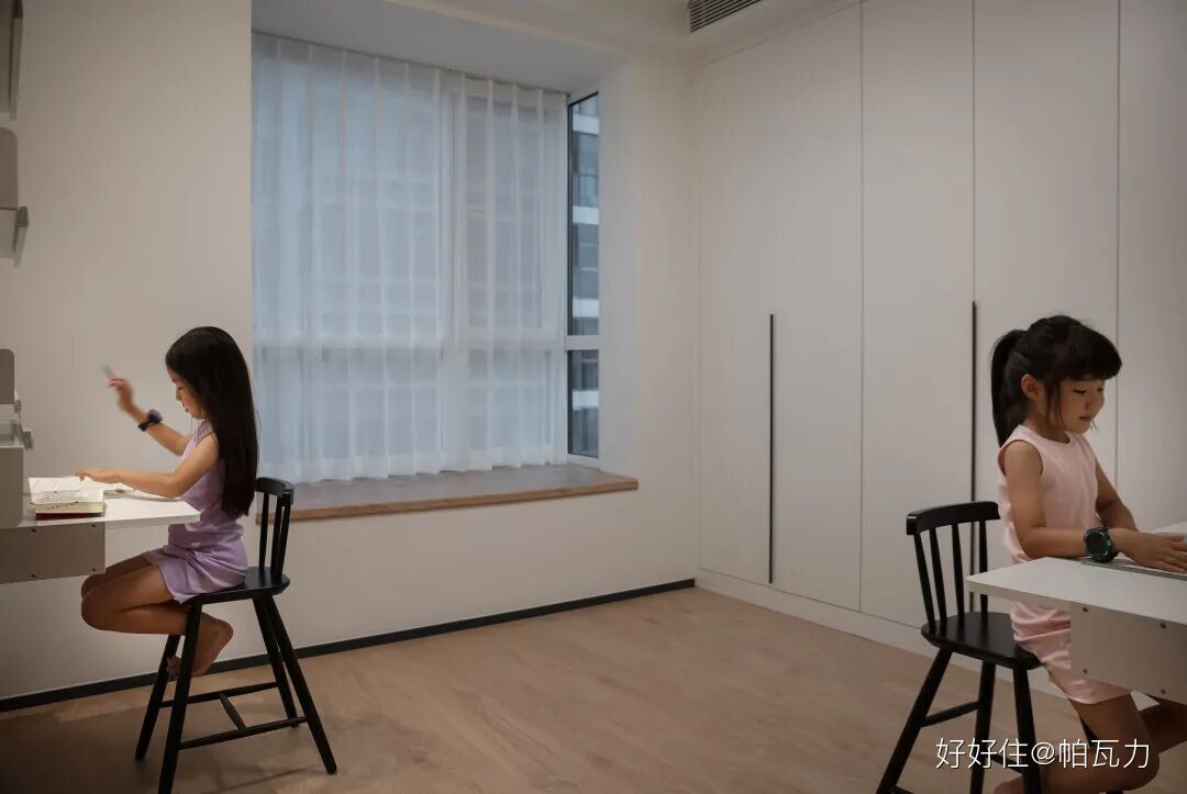 为两个孩子各留了一面墙,供她们收录自己的画作。小桌子可以做手工、画画,平时也可以收纳到柜子下面,空出活动和休息空间。设计师认为,儿童房不要用大人的思维去定性,可以多留白,用小孩的创造力慢慢填满。