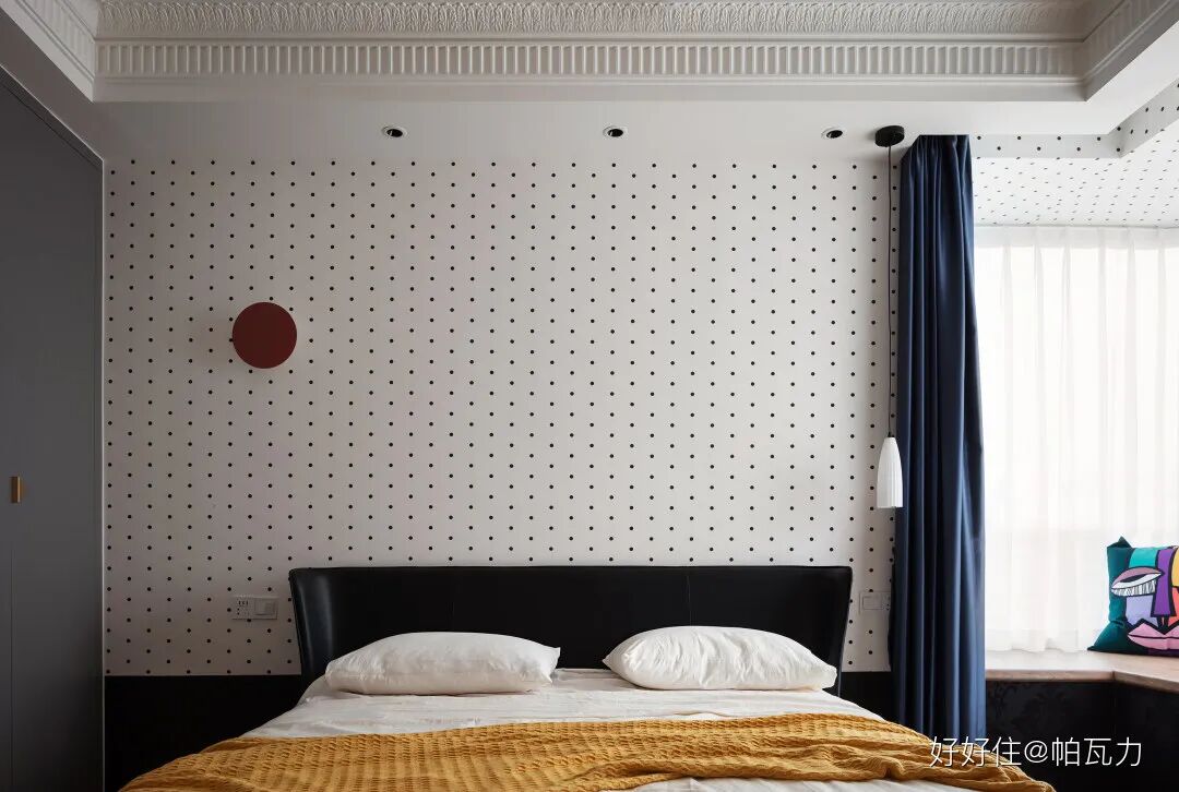 主卧一面墙向儿童房外移,推出一个衣帽间。将客厅的搭配浓缩成各种色块,丰富主卧的设计元素。两种壁纸拼接,飘窗以地板做台面,设计师很抠收口这种细节。