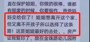 逃不出男权偏见的丈夫,和婆家人一起,认定在家带两个孩子的杨某,不会赚钱,只会花钱,时常在争执中对她实施家暴。所以,在小儿子断奶后,她果断出去上班,在家附近的超市觅得一份工作,既能照顾孩子,也能有点收入。就像一个被冤枉的服刑者,在申诉无望后,决定越狱求生一样。她重新就业不过一两个月,经济能力仍捉襟见肘;长期PUA她的夫家人,远比她想得要顽固残忍。3月11日,丈夫约她见面,说是就离婚之事,和她协商。“爸爸妈妈交给你了!姐姐想离开这个家,但又离不开孩子。所以选择这条路!这是姐姐最好的去处!” ![]()