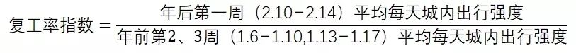 首先,复工是由各地方政府来精准施策的,不少城市还需要有企业进行复工申请和批示,而这些数据我们暂时不能获取,因此,我们换了一个思路,即是利用百度地图数据计算出各个城市内部的人流活力恢复情况,近似地代表各个城市线下复工率大体状况,因此,我们就有了一下这个公式: