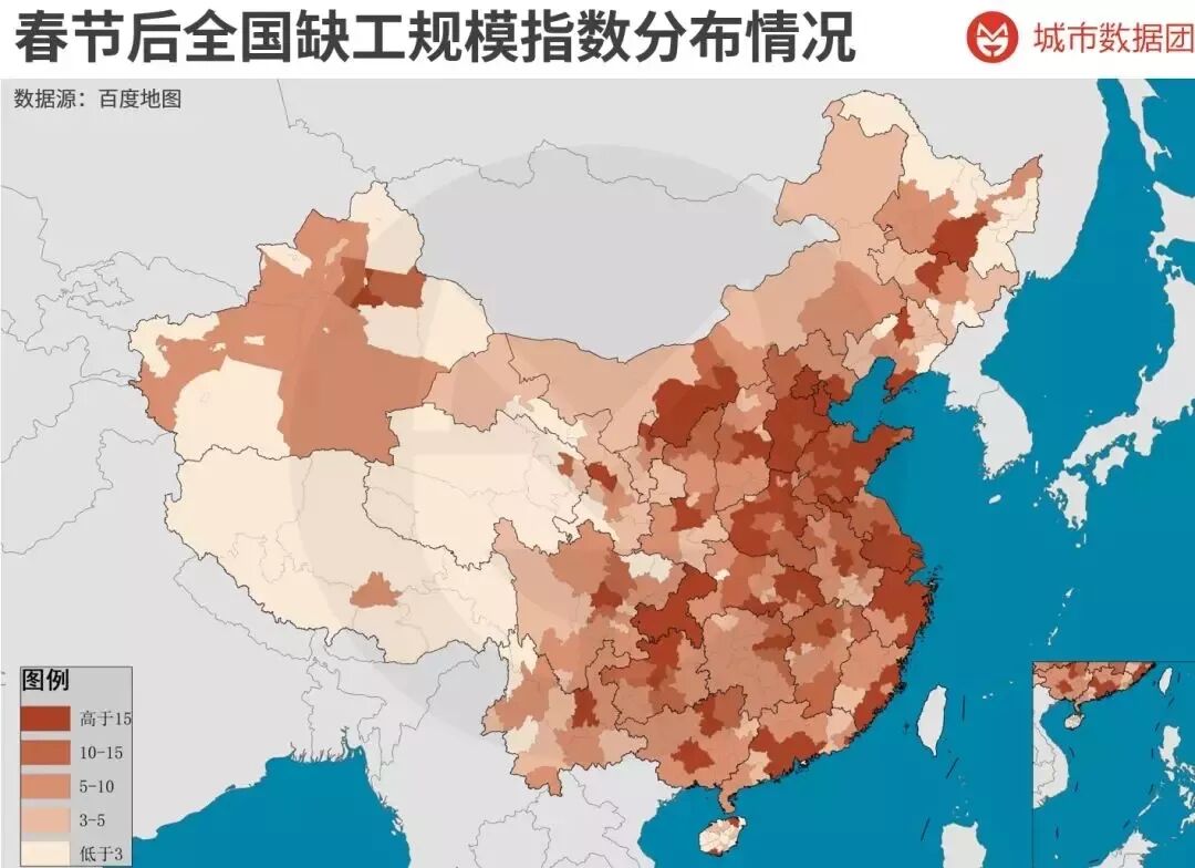 上图中,京津冀、长三角核心区、珠三角和许多省会城市都呈现深红色,这意味着比较严重的缺工。